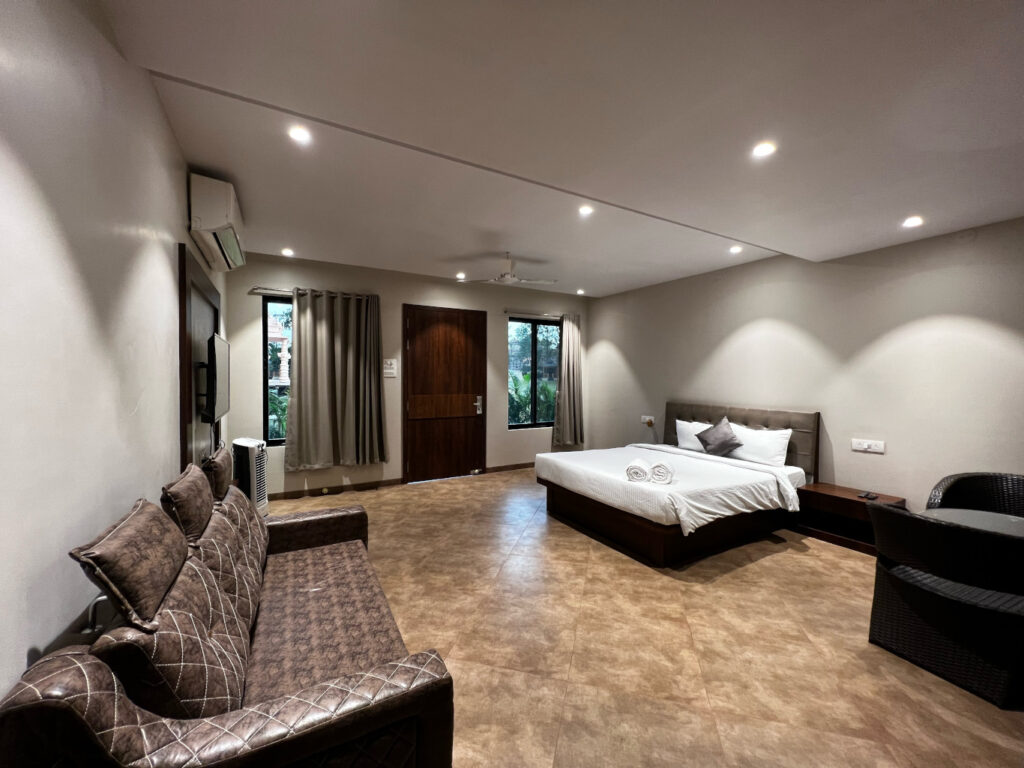 300 sq. ft. room with a Queen bed, sofa-cum-bed, and balcony. Includes Smart TV, Wi-Fi, air-conditioning, hot/cold water, shower, and toiletries.